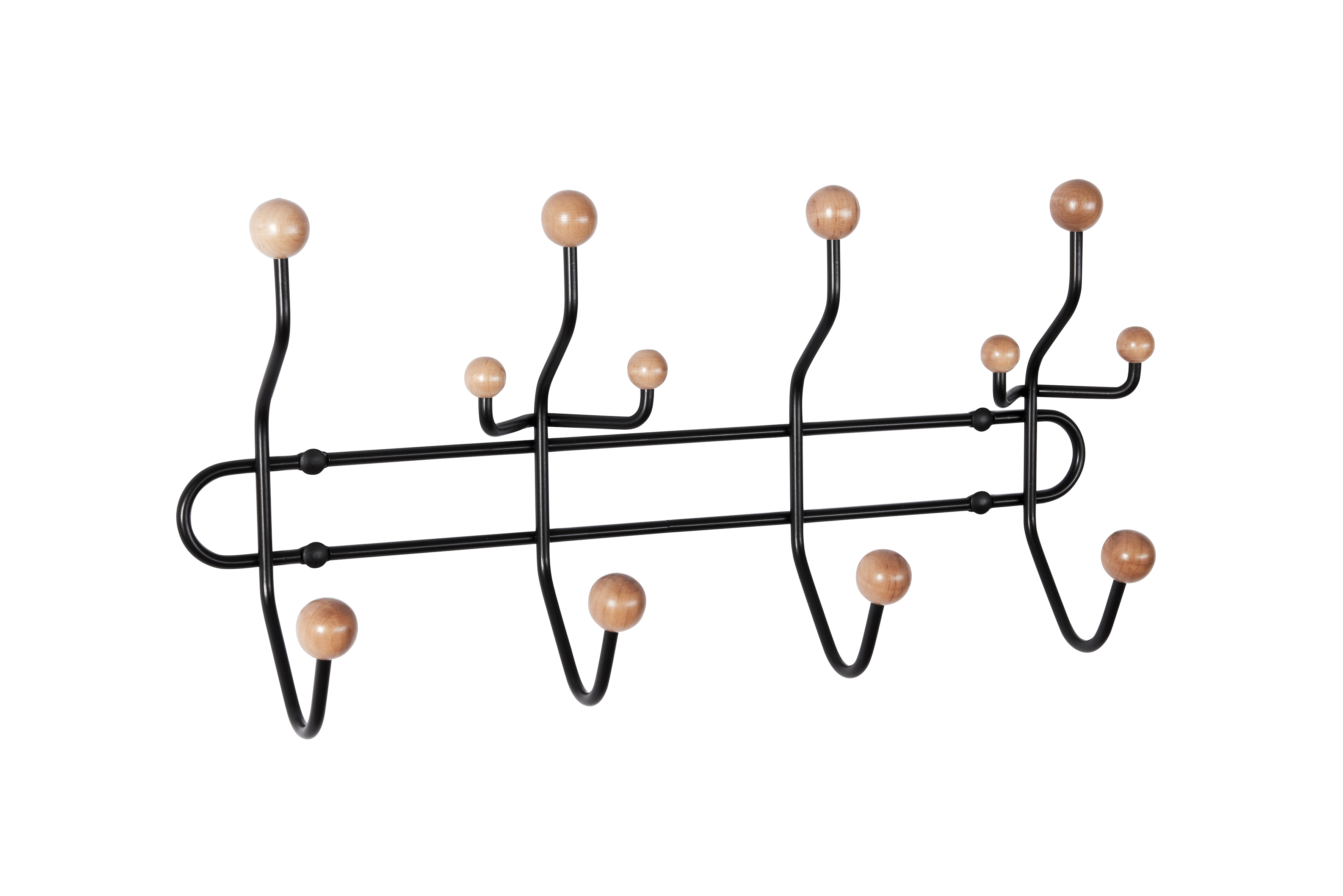 Sir James knagerække er en moderne knagerække af sort lakeret stål og knopper af massivt træ i nøddetræslook. Knagerækken består af 4 knager, der med sine 12 knopper forøger opbevaringsmulighederne – så der altid er plads til en ekstra jakke. Den enkle og lette knagerække giver et stilet udtryk i sammenspil med de runde træknopper. Knopperne er af to størrelser, hvilket skaber spændende dimensioner og dybde i designet. Desuden er monteringen elegant og næsten usynlig, da den skjules, således at den nærmest går i ét med stellet. Knagerækken bidrager med detalje og personlighed i din entré.