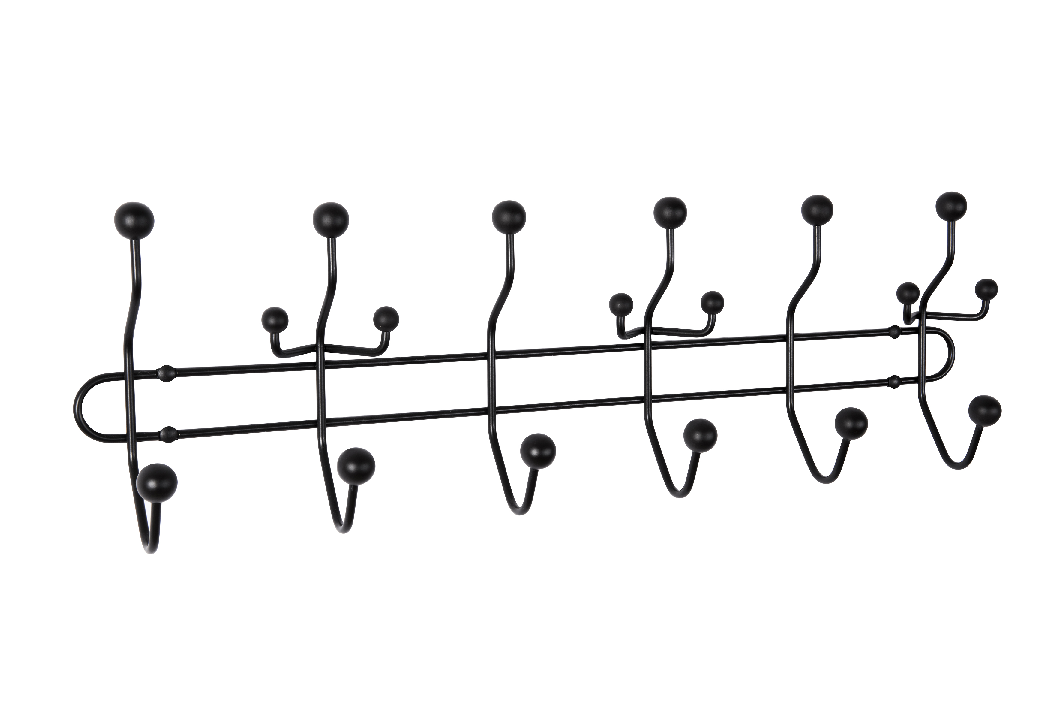 Sir James knagerække er en moderne knagerække af sort lakeret stål og knopper af massivt sortmalet træ. Knagerækken består af 6 knager, der med sine 18 knopper forøger opbevaringsmulighederne – så der altid er plads til en ekstra jakke. Den enkle og lette knagerække giver et stilet udtryk i sammenspil med de runde træknopper. Knopperne er af to størrelser, hvilket skaber spændende dimensioner og dybde i designet. Desuden er monteringen elegant og næsten usynlig, da den skjules, således at den nærmest går i ét med stellet. Knagerækken bidrager med detalje og personlighed i din entré.