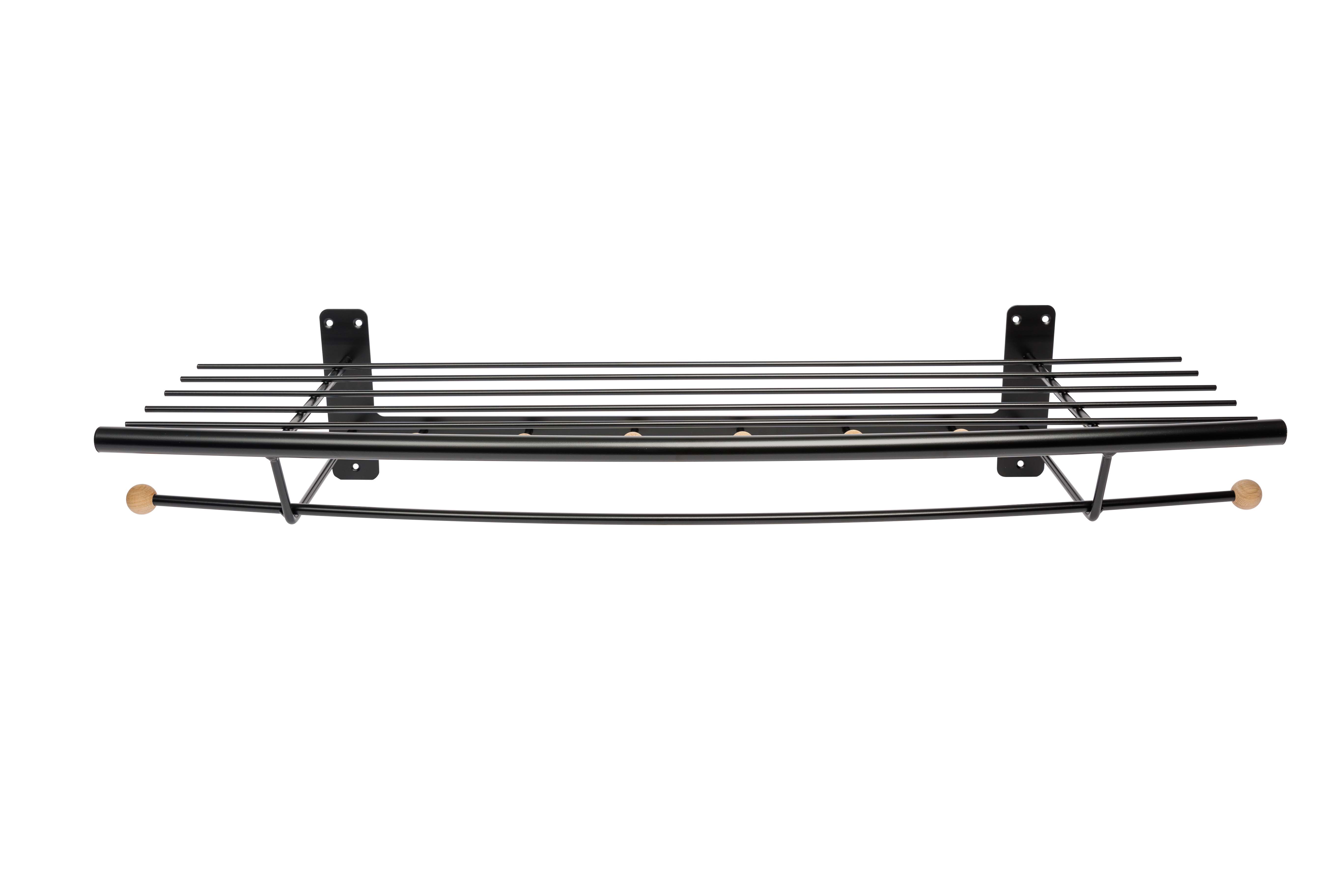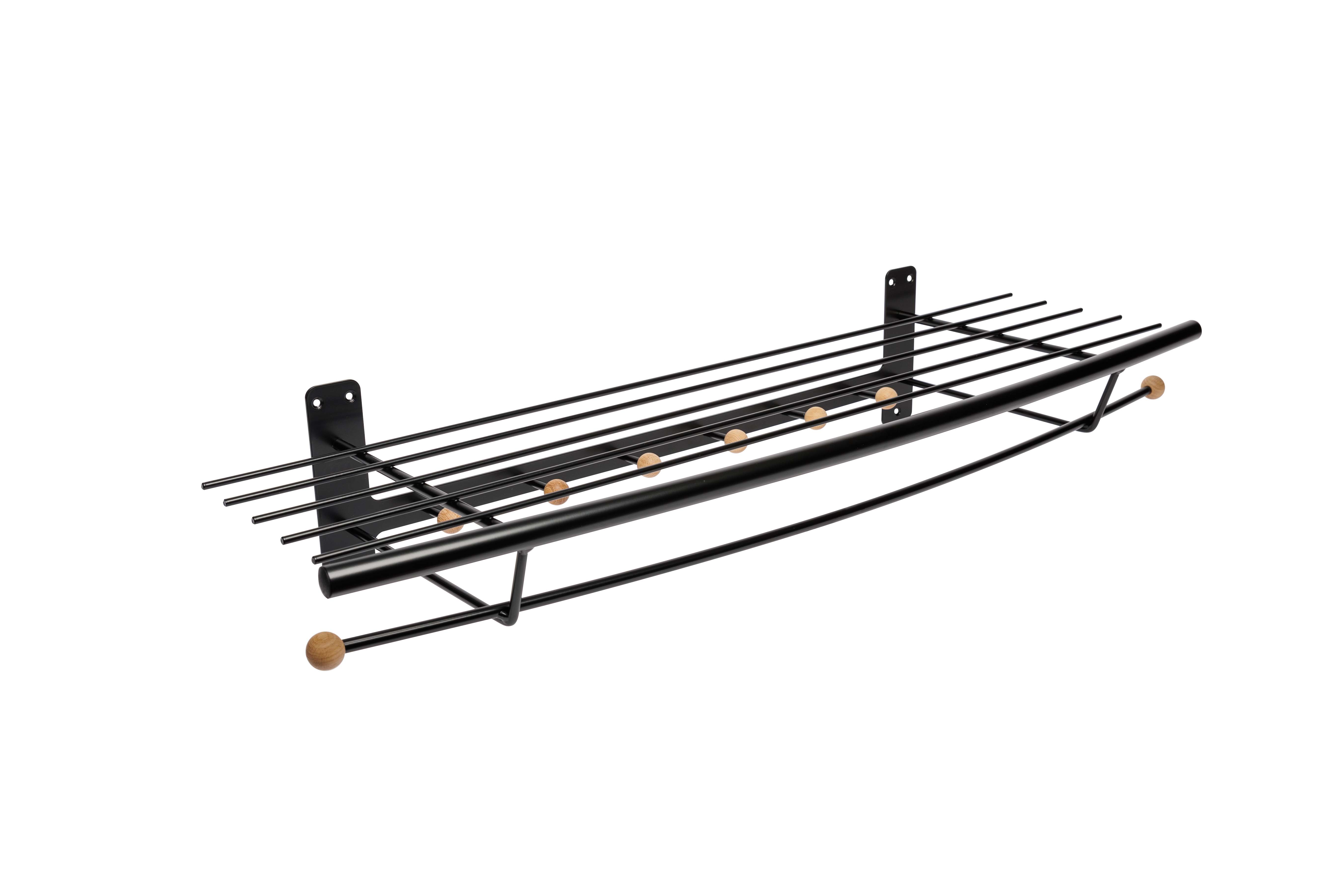 Sir James 7 hattehylde er en multifunktionel opbevaringsløsning til entréen, der gør den nemt at organisere dine jakker, tasker og andet tilbehør. Hattehylden samler tre ideelle opbevaringsmøbler i ét møbel, idet den består af en hylde, en bøjlestang og en knagerække. Materialerne af massivt eg og sort farvelakeret stål skaber i kombination med de afrundede kanter og bløde former et simpelt og luftigt design. Hertil udgør de runde træknopper en flot detalje, der desuden fungerer som modhager på knagerne, således at overtøjet i glider ned. Knopperne går igen på bøjlestangen, hvortil Sir James bøjlen ville være et godt match. Hattehylden tilbyder opbevaring af både stort og småt, og den passer ligeledes ind i både store og små entréer, idet den leveres i tre forskellige størrelser.