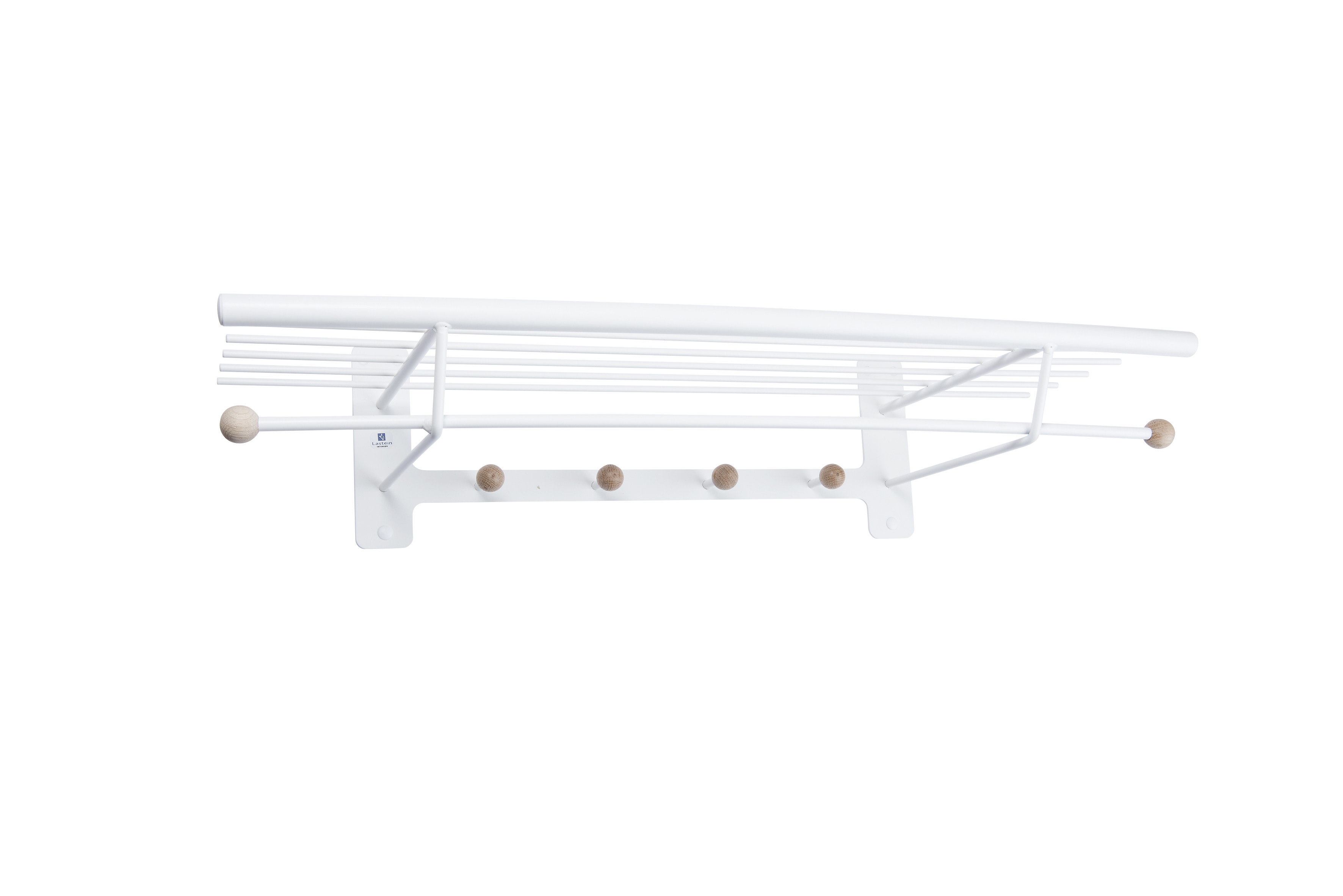 Sir James 7 hattehylde er en multifunktionel opbevaringsløsning til entréen, der gør den nemt at organisere dine jakker, tasker og andet tilbehør. Hattehylden samler tre ideelle opbevaringsmøbler i ét møbel, idet den består af en hylde, en bøjlestang og en knagerække. Materialerne af egetræ og hvidt farvelakeret stål skaber i kombination med de afrundede kanter og bløde former et simpelt og luftigt design. Hertil udgør de runde træknopper en flot detalje, der desuden fungerer som modhager på knagerne, således at overtøjet i glider ned. Knopperne går igen på bøjlestangen, hvortil Sir James bøjlen ville være et godt match. Hattehylden tilbyder opbevaring af både stort og småt, og den passer ligeledes ind i både store og små entréer, idet den leveres i tre forskellige størrelser.