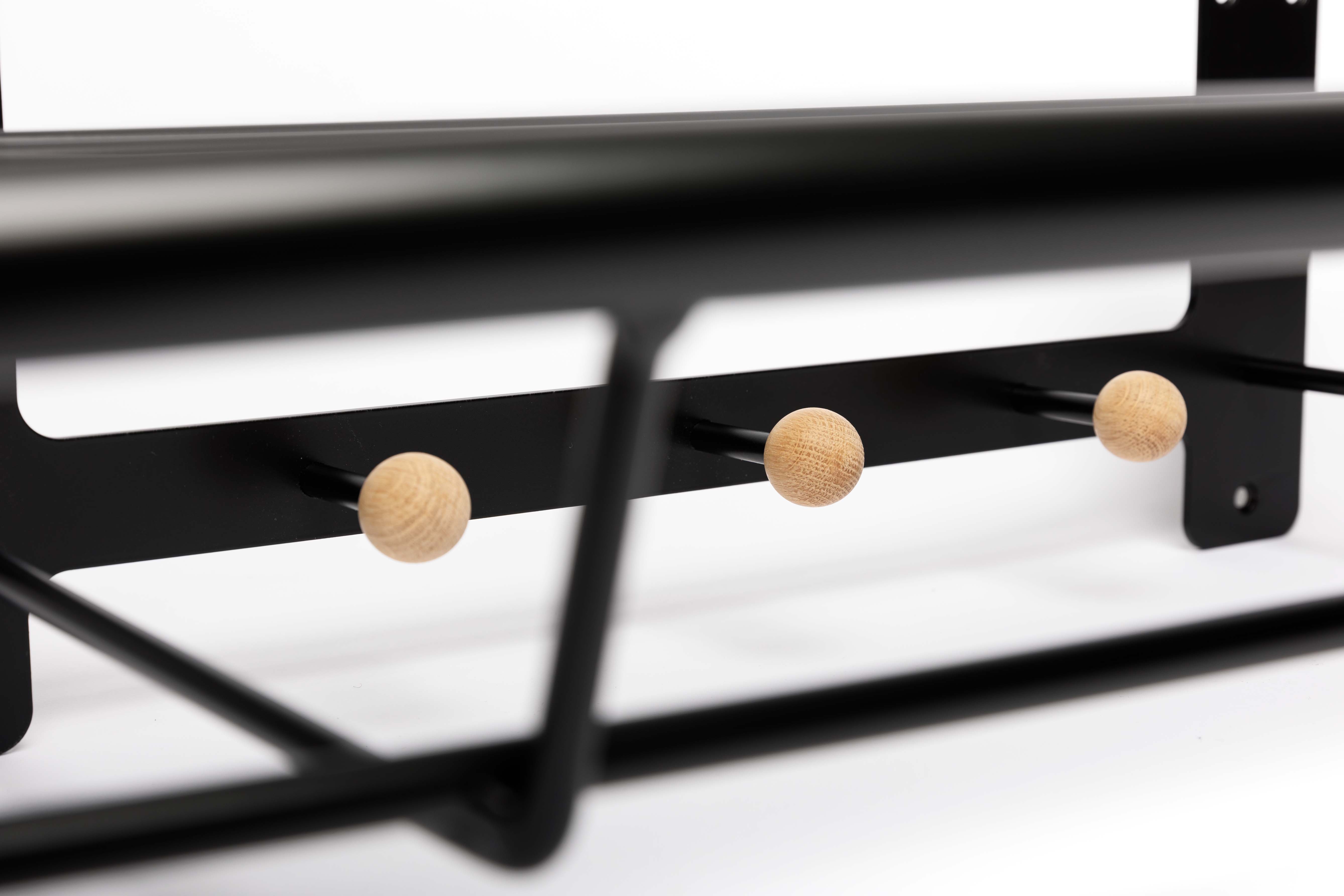 Hertil udgør de runde træknopper en flot detalje, der desuden fungerer som modhager på knagerne, således at overtøjet i glider ned. Knopperne går igen på bøjlestangen, hvortil Sir James bøjlen ville være et godt match.
