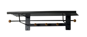 Sir James 7 hattehylde er en multifunktionel opbevaringsløsning til entréen, der gør den nemt at organisere dine jakker, tasker og andet tilbehør. Hattehylden samler tre ideelle opbevaringsmøbler i ét møbel, idet den består af en hylde, en bøjlestang og en knagerække. Materialerne af massivt træ farvet i nøddetræslook og sort farvelakeret stål skaber i kombination med de afrundede kanter og bløde former et simpelt og luftigt design. Hertil udgør de runde træknopper en flot detalje, der desuden fungerer som modhager på knagerne, således at overtøjet i glider ned. Knopperne går igen på bøjlestangen, hvortil Sir James bøjlen ville være et godt match. Hattehylden tilbyder opbevaring af både stort og småt, og den passer ligeledes ind i både store og små entréer, idet den leveres i tre forskellige størrelser.
