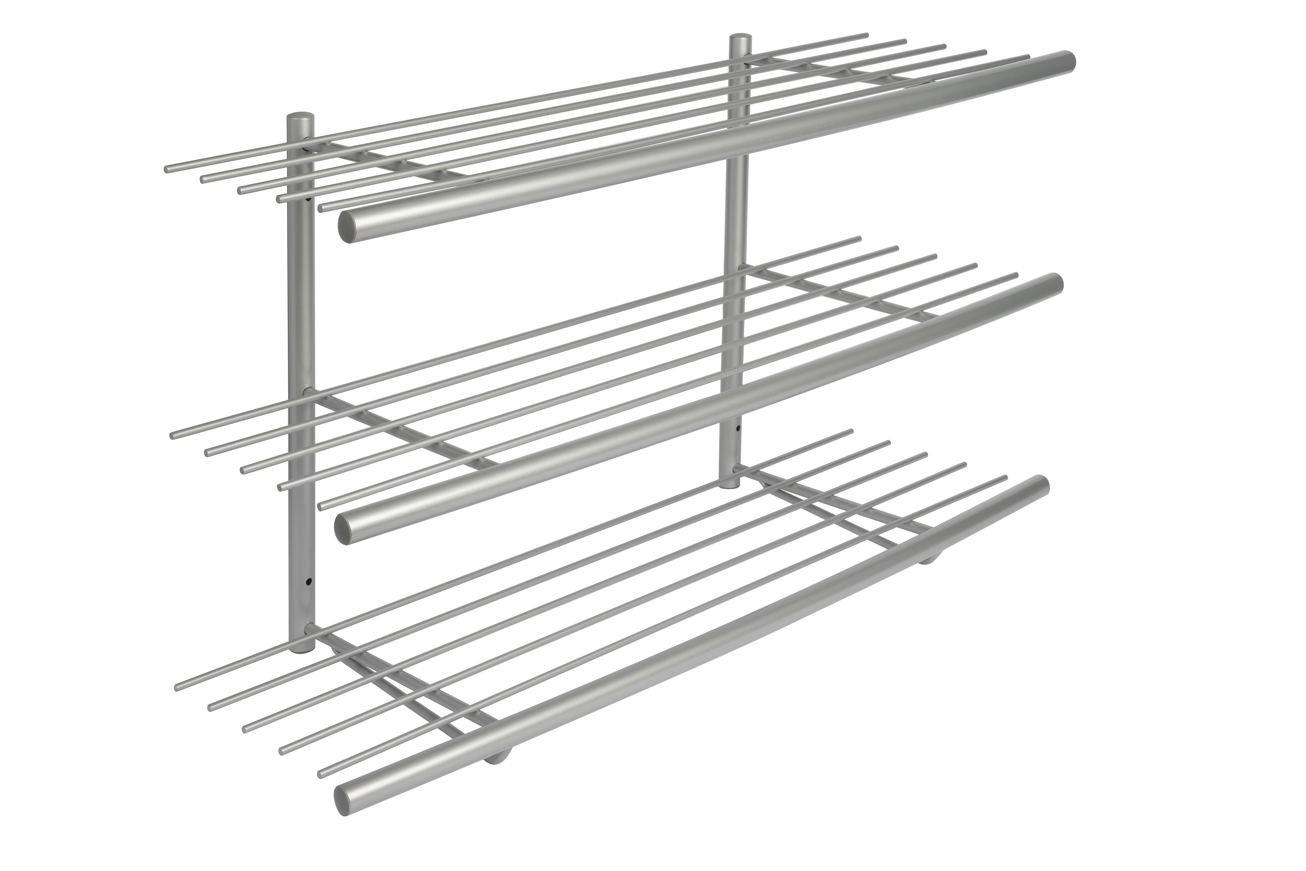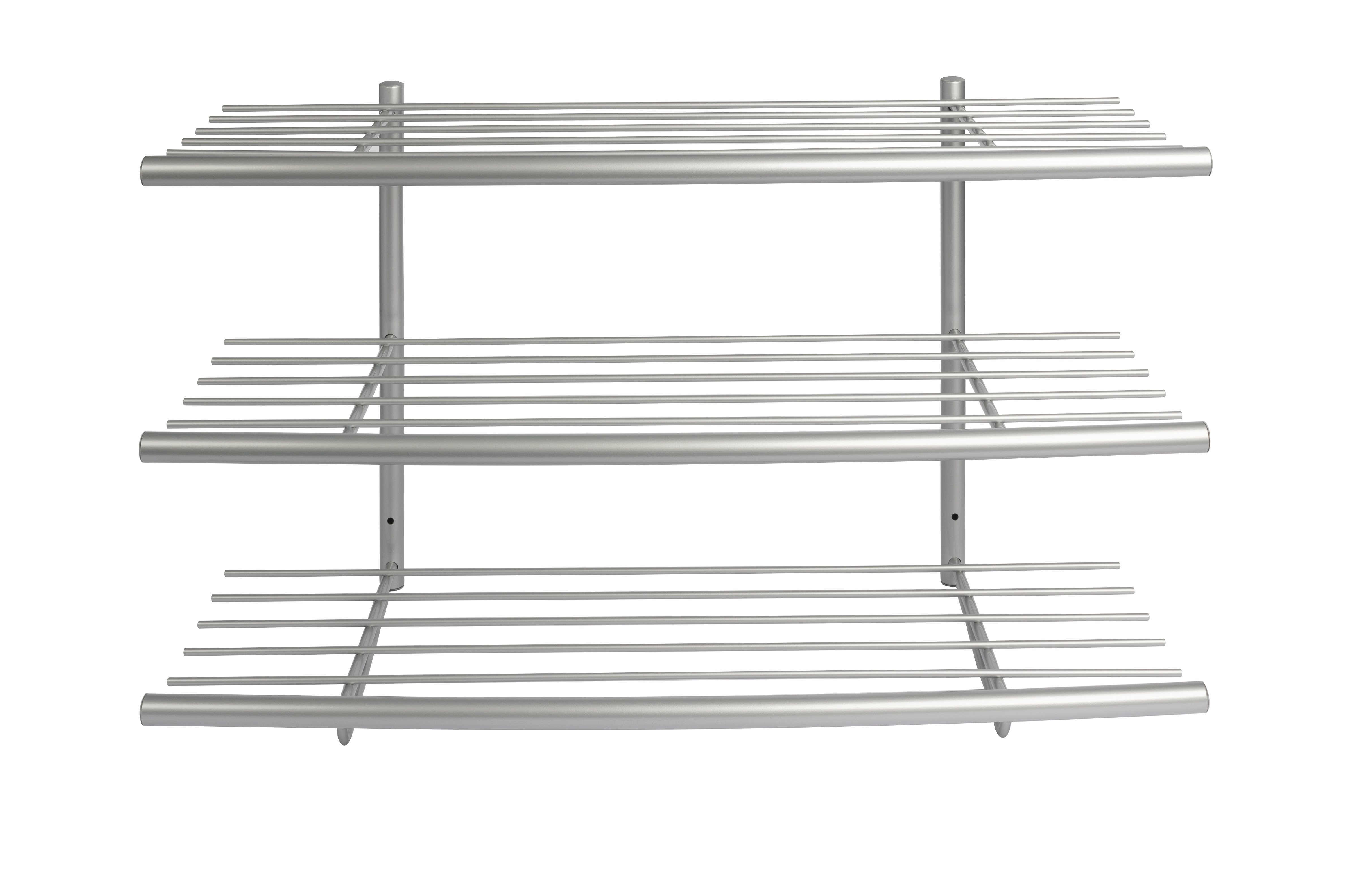 Sir James skohylde med 3 hylder er et let og elegant møbel til opbevaring af fodtøj. Alt efter behov kan skohylden placeres på gulvet eller monteres på væggen, hvilket gør den fleksibel at implementere i entréindretningen. De aluminiumsfarvede hylder er praktiske, da det er slidstærkt og nemt at rengøre. Designet er enkelt og let, idet 5 spinkle stænger tilsammen udgør hver enkelt hylde, således at man undgår et kompakt og tungt møbel, der fylder i entréen. Hyldernes fronter består af et mere markant stel, der er let afbøjet, således at skohylden får et blødt udtryk. Sir James skohylde skaber altså luft i entréen og tilbyder gode opbevaringsmuligheder med sine 3 hylder.