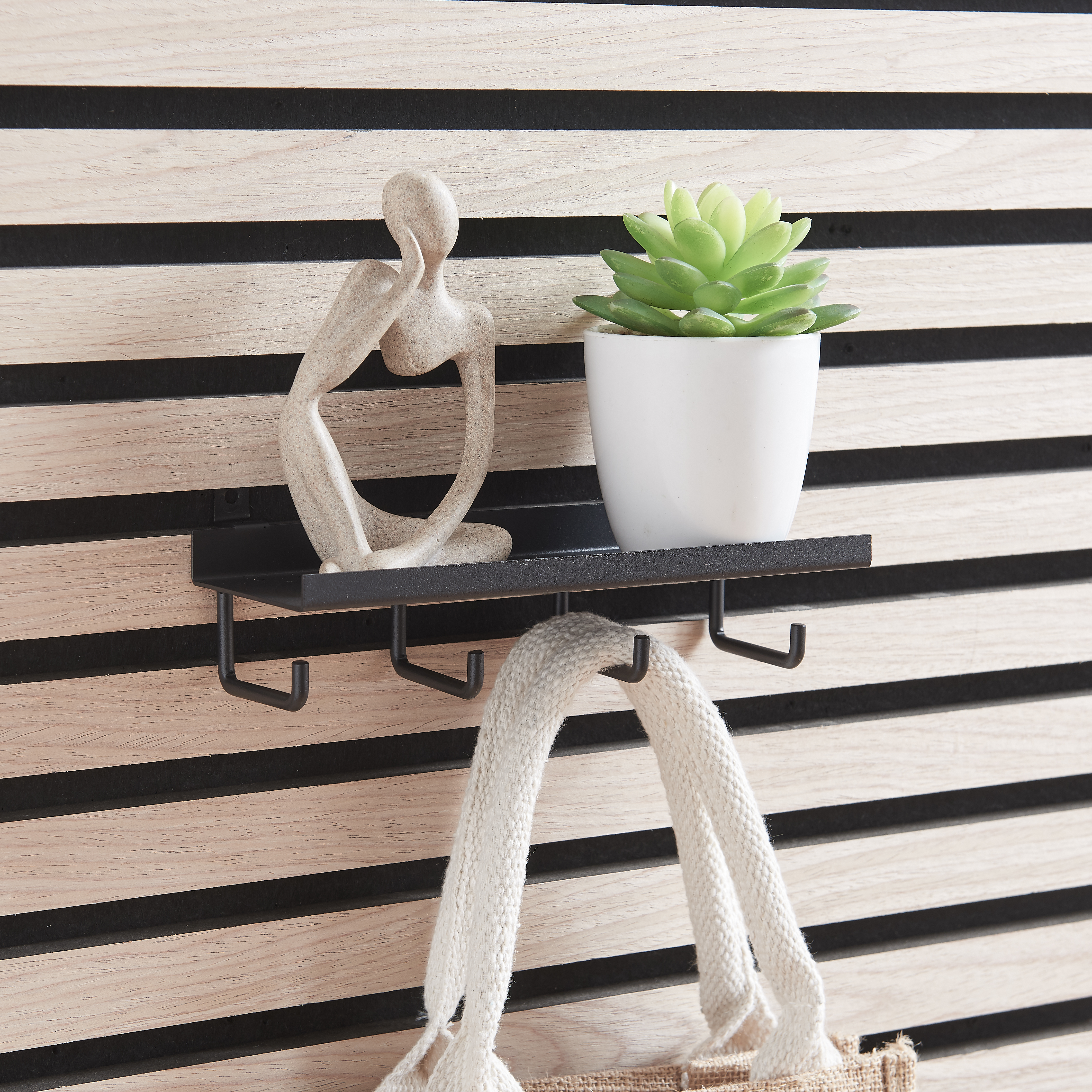 Forvandl din opbevaringsplads med den elegante Millex hylde med 4 kroge, perfekt til montering på akustikpaneler både lodret og vandret. Denne hylde i mat sort tilbyder en praktisk løsning til organisering af nøgler, tasker og små genstande. Med de medfølgende skruer er installationen enkel og hurtig, så du kan skabe orden i dit hjem uden besvær.