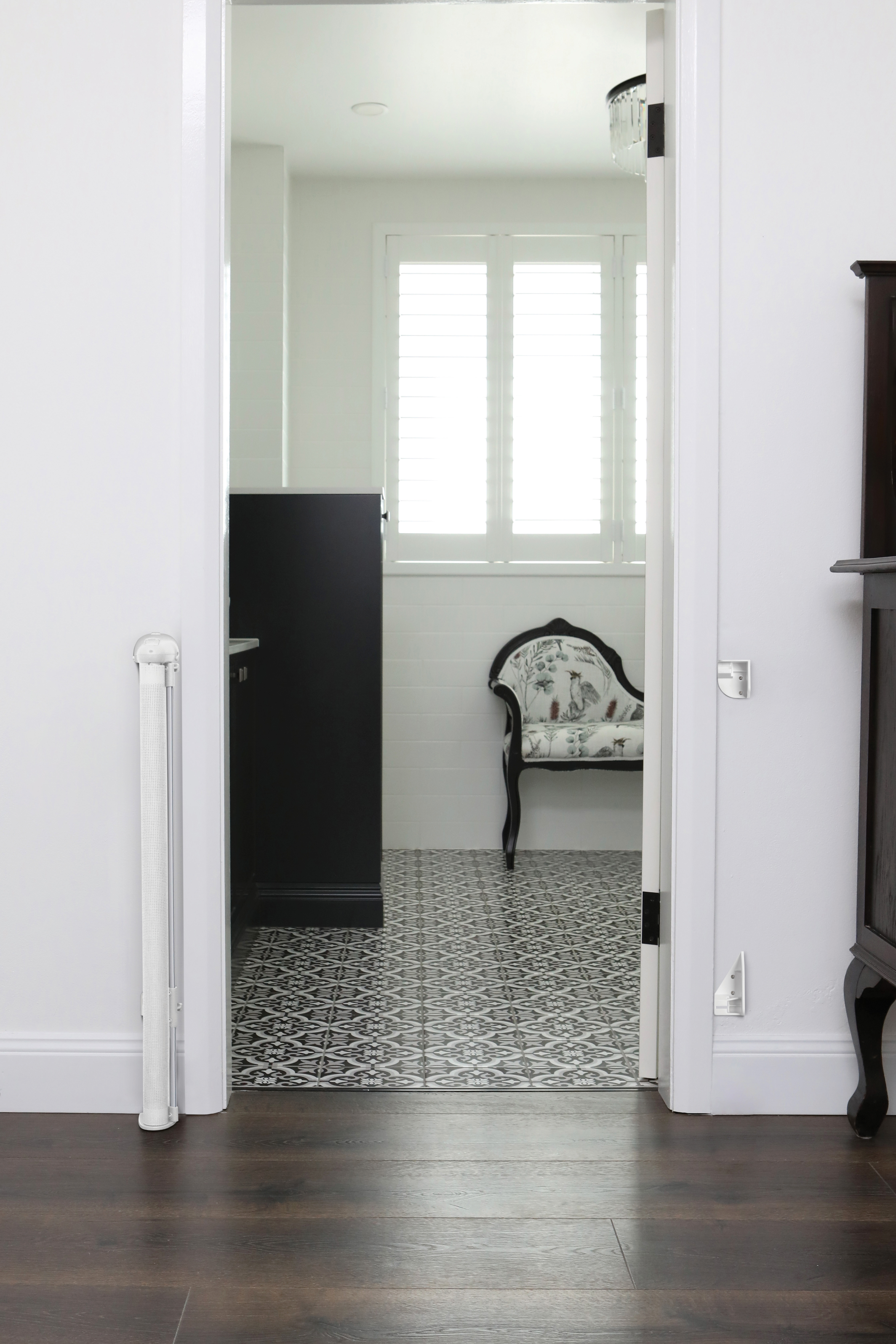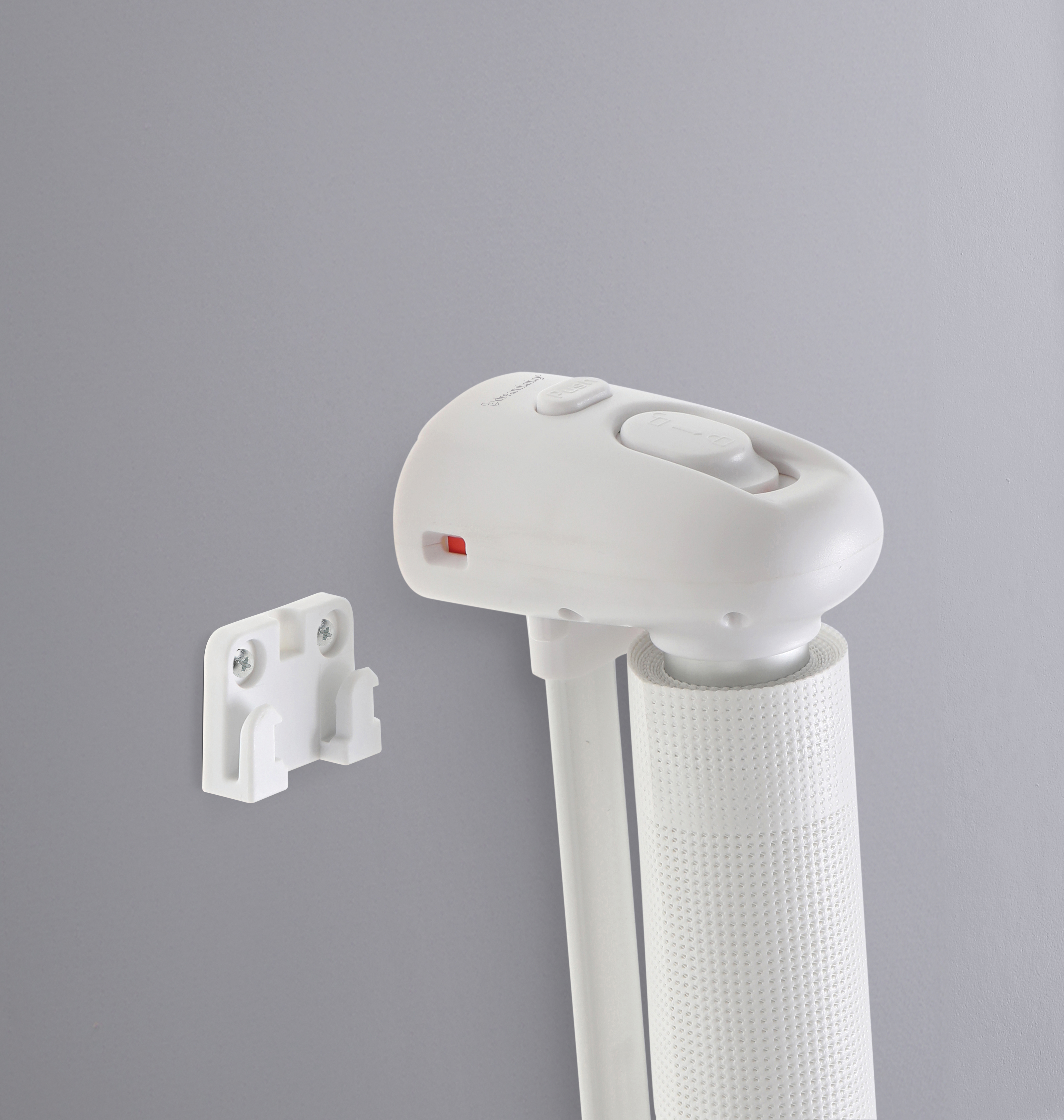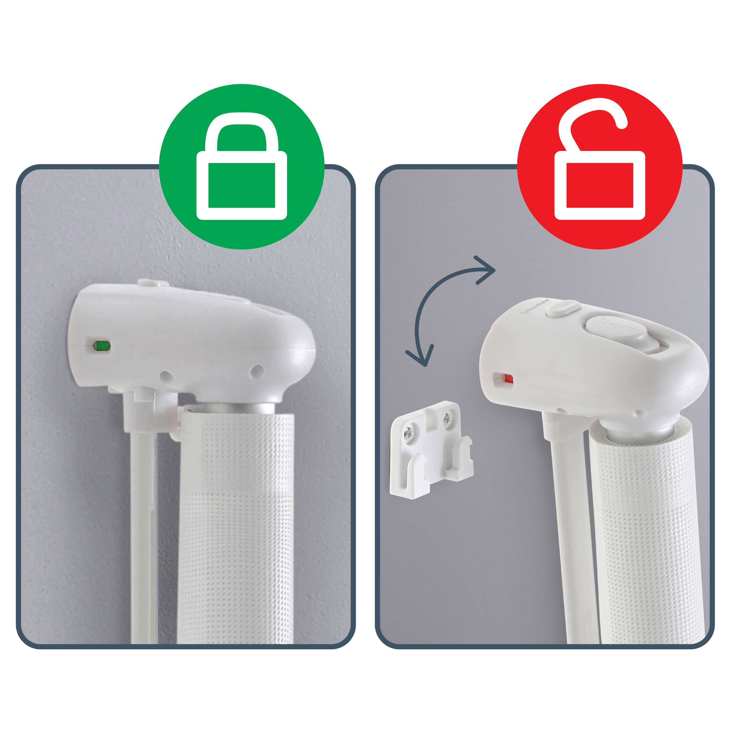 Installationen er hurtig og nem takket være de selvklæbende monteringsskabeloner, og der er ikke behov for tilpasning til fodpaneler, da bundbeslaget er hævet. For ekstra tryghed har gitteret 2 EZY-Check låseindikatorer: grøn viser, at gitteret er korrekt monteret og låst, mens rød indikerer, at det ikke er det. Sørg altid for, at begge indikatorer er grønne, når gitteret er i brug. Gitteret overholder standarden BS EN 1930:2011 og er velegnet til børn op til 24 måneder.