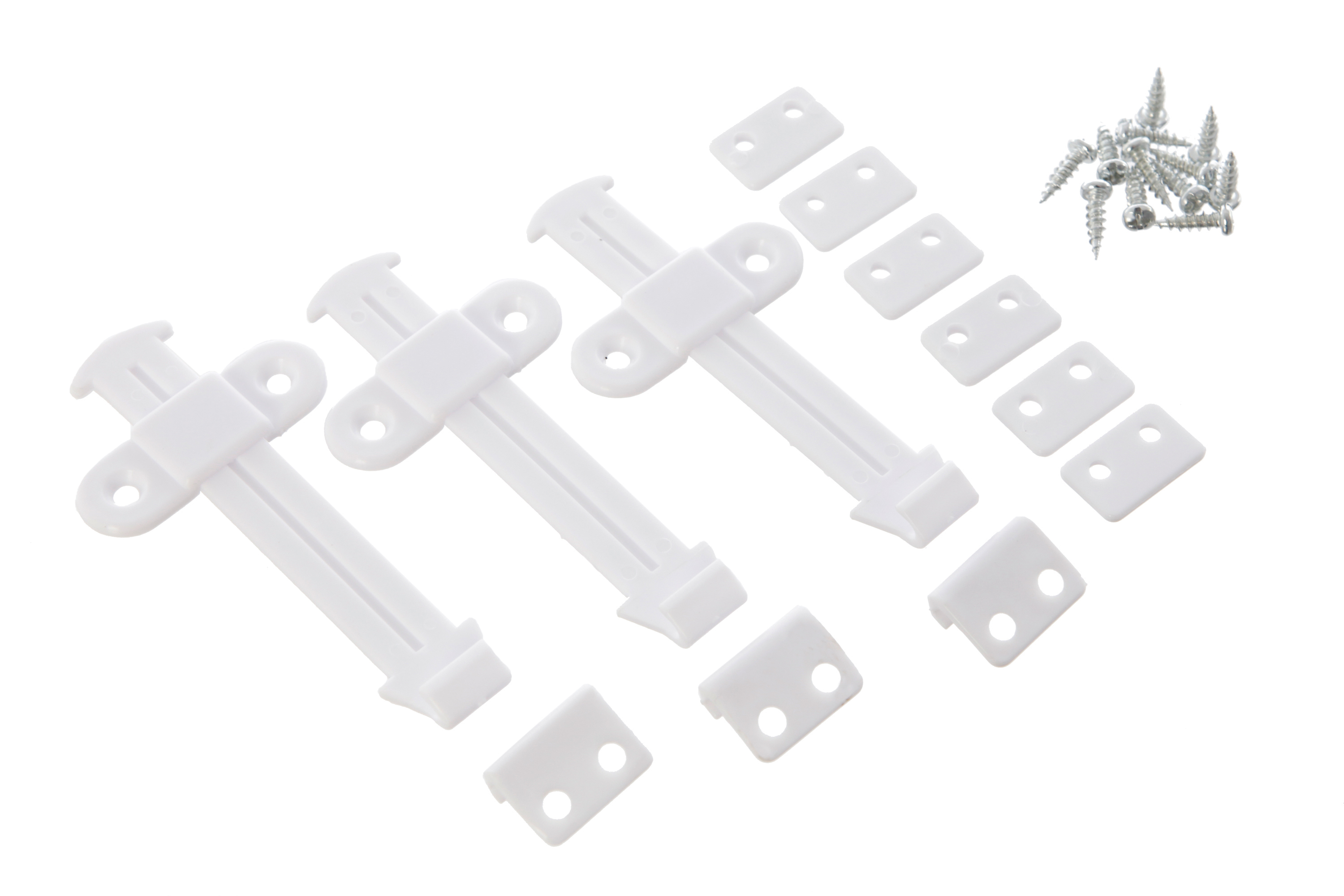 Fremstillet af polypropylen. Hjælper med at sikre skuffer hurtigt og nemt. Løft blot kroken udad for at frigive låsen. Låser automatisk, når skuffen lukkes. Hjælper med at sikre de fleste skuffer på metalruller. Let for voksne at bruge, men svært for børn at åbne.